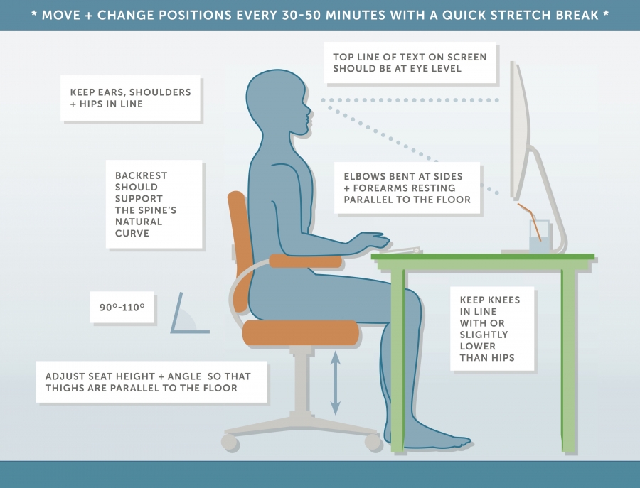 More important than maintaining “perfect” posture is moving and changing positions. Avoid sitting in one position for longer than 30-50 minutes at a time. Take a quick stretch break or, even better, get up and move around. While sitting, try to change positions periodically.